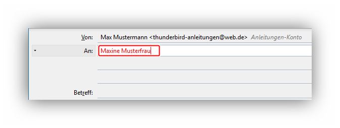 Falls keine Kontakte vorhanden sind, die zu dem eingetippten Text passen, wird der Text rot angezeigt. Man muss dann die korrekte E-Mail-Adresse des Empfängers selbst eintippen! Im gezeigten Bild müsste man also "Maxine Musterfrau" durch die entsprechende E-Mail-Adresse ersetzen.
