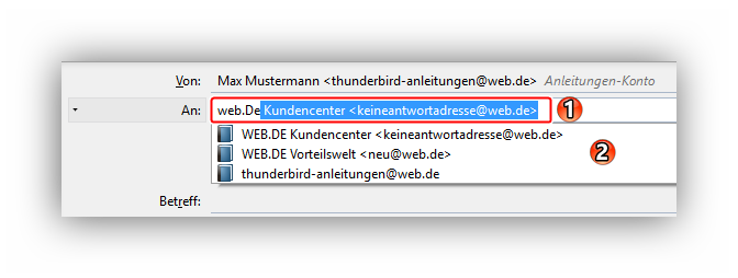 Wenn man einen Namen oder einen Teil einer E-Mail-Adresse eintippt, zu dem gespeicherte Kontakte in Adressbüchern vorhanden sind, wird die Adresse mit dem ersten passenden Vorschlag automatisch vervollständigt (Punkt 1 - der blau hinterlegte Teil wurde als Vorschlag von Thunderbird eingetragen). Zusätzlich erhält man eine Auswahl-Liste (Punkt 2) mit den passenden Kontakten. (Man sieht im Beispiel-Bild, dass teilweise der Name "WEB.DE....." und teilweise die E-Mail-Adresse ".......@web.de" zum Vorschlag geführt hat.) Wenn man mit dem Vorschlag direkt in der Eingabezeile einverstanden ist, kann man die Eingabetaste drücken, um ihn zu übernehmen. Um einen Vorschlag aus der Auswahl-Liste zu verwenden, klickt man auf den Eintrag in der Liste.