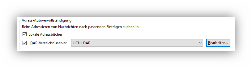 In Thunderbirds Einstellungen-Dialog findet man unter ➔ Einstellungen ➔ Verfassen ➔ Adressieren die Auswahl, ob in Thunderbirds lokalen Adressbüchern gesucht werden soll und ob (wenn man Zugriff darauf hat) auf einem LDAP-Verzeichnisserver gesucht werden soll.