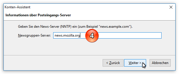 Jetzt müssen Sie die Adresse des Newsgruppen-Servers eingeben (Punkt 4), an dem Sie sich anmelden wollen. Bestätigen Sie wieder mit einem Klick auf Weiter: