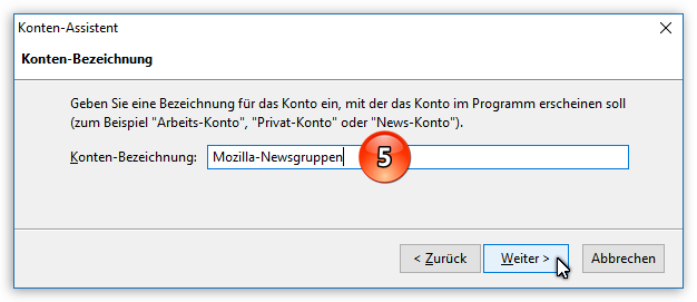 Nun werden Sie nach einer frei wählbaren Konten-Bezeichnung (Punkt 5) für Ihr Konto gefragt. Dieser Name wird später in Thunderbird in der Konten-/Ordnerliste angezeigt. Klicken Sie nach der Eingabe wieder auf Weiter.