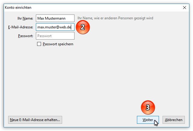 Im Bildschirmfoto haben wir ein frei erfundenes Konto bei einem der bekannten E-Mail-Provider als Beispiel genommen. Geben Sie hier Ihren Namen und Ihre korrekte E-Mail-Adresse ein (Punkt 2). Das zugehörige Passwort für den Zugriff auf Ihr Postfach kann jetzt oder erst später eingegeben werden. Falls Sie das Passwort schon jetzt eingeben, können Sie mit der Option