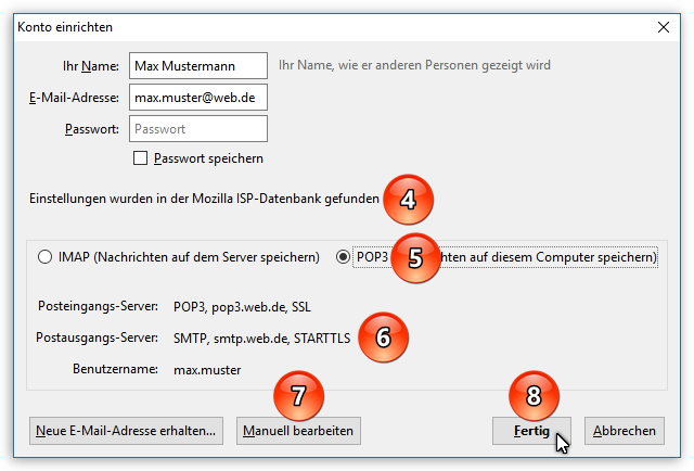 Nun versucht Thunderbird automatisch die für Sie richtigen Server-Einstellungen zu finden. Dafür gibt es die "Mozilla ISP-Datenbank", in der die Einstellungen von vielen Postfach-Anbietern eingetragen sind. Wenn in dieser Datenbank nichts gefunden wird, versucht Thunderbird durch einen bestimmten Algorithmus die korrekten Daten herauszufinden. Dies klappt bei vielen E-Mail-Providern und Servern, aber leider nicht immer. Ist Thunderbird mit der Suche erfolgreich gewesen, sehen Sie den Hinweis auf die ISP-Datenbank (Punkt 4), ob POP3 oder IMAP verwendet wird (Punkt 5) und welche Server-Adressen und Sicherheits-Einstellungen (Punkt 6) genutzt werden sollen:
