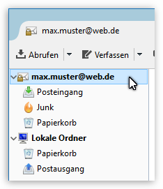 Thunderbird zeigt in der Konten-/Ordnerliste links im Hauptfenster die bisher vorhandenen Ordner des Kontos an. Zu Beginn sind dies bei einem POP-Konto meist nur der "Posteingang" und der "Papierkorb". Sobald einer der weiteren speziellen Ordner ("Archiv", "Entwürfe", "Gesendet", "Junk", "Vorlagen") benötigt wird, erstellt Thunderbird diesen automatisch: