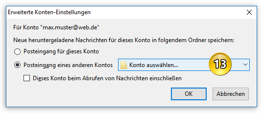 Per Klick auf Erweitert... (Punkt 11) gelangen Sie zu den Optionen für den sogenannten "" (Punkt 13). Damit lassen sich POP-Konten zusammenfassen, sodass man gemeinsame (und somit weniger) Ordner für mehrere POP-Konten nutzen kann. Bitte lesen Sie dazu die .