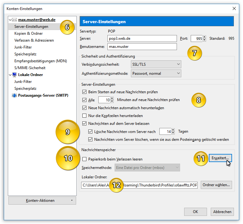 Bei den Server-Einstellungen (Punkt 8) können Sie festlegen, wann bzw. wie häufig Thunderbird Nachrichten vom Server abrufen soll.