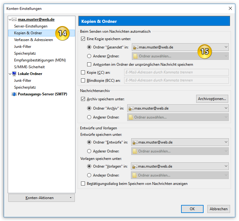 Im Bereich "Kopien & Ordner" (Punkt 14) können Sie festlegen, wo Thunderbird bestimmte E-Mails speichern soll. Dies können Sie hier für gesendete Nachrichten, Entwürfe und Vorlagen festlegen. Außerdem bietet Thunderbird die Möglichkeit, E-Mails zu archivieren. Dieses Archiv ist im Grunde nichts anderes als ein oder mehrere dafür festgelegte Ordner, wo Sie später mit einem einfachen Tastendruck auf A ausgewählte E-Mails automatisch und schnell einsortieren lassen können. Dazu wird aber an anderer Stelle mehr erklärt.
