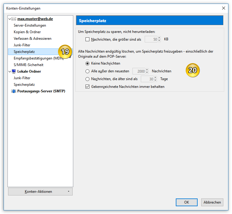 Zusätzlich können E-Mails, die zuvor heruntergeladen wurden, auch automatisch wieder gelöscht werden, um Speicherplatz frei zu machen (Punkt 20). "Gekennzeichnete" Nachrichten kann man explizit von der Maßnahme ausschließen.