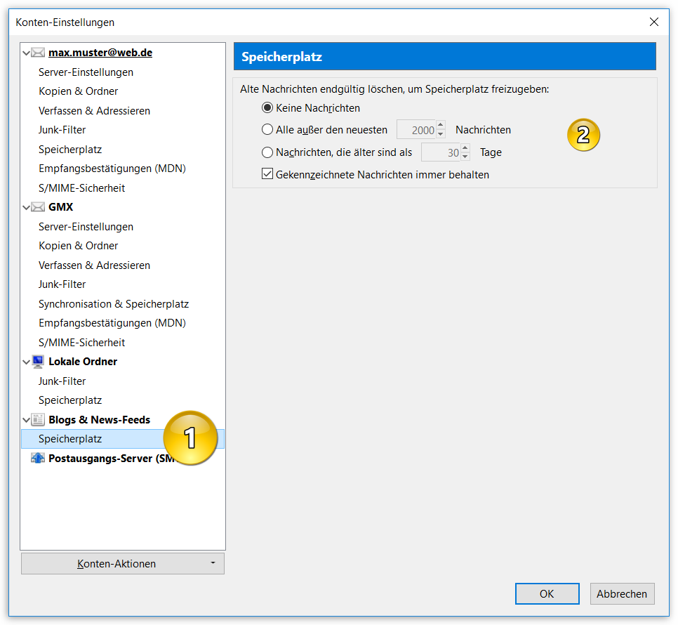 Damit die abonnierten Feeds auf Dauer nicht unkontrolliert viel Speicherplatz auf Ihrem Datenträger verbrauchen, können Sie in den Konten-Einstellungen des Feed-Kontos im Bereich "Speicherplatz" (gelber Punkt 1) festlegen, welche Daten wie lange und bis zu welchen Grenzen gespeichert werden sollen (gelber Punkt 2![]()