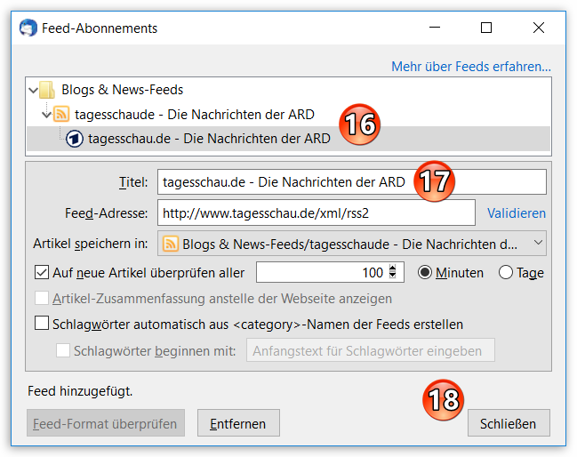 Sie können in dem Feed-Abonnements-Dialog nochmals jeden einzelnen Feed markieren und die zugehörigen Einstellungen kontrollieren/anpassen.