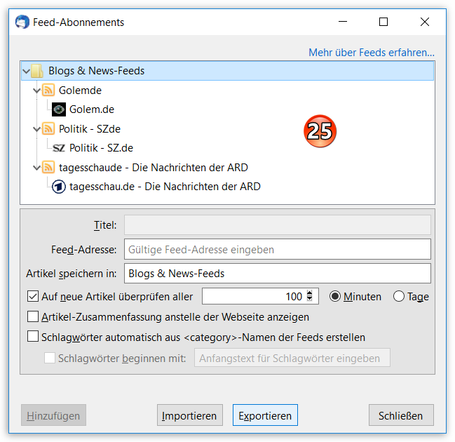 Eventuell dauert es einen Moment und im Feed-Abonnements-Dialog wird gezeigt, dass die Feeds hinzugefügt werden. Sobald der Import abgeschlossen wurde, sind die Feeds nun in Thunderbird vorhanden und abonniert (Punkt 25![]()