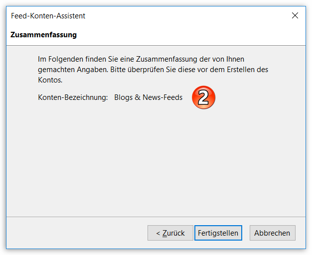 Ihnen wird nun eine kurze Zusammenfassung (Punkt 2) angezeigt, die Sie mit einem Klick auf Fertigstellen bestätigen müssen.