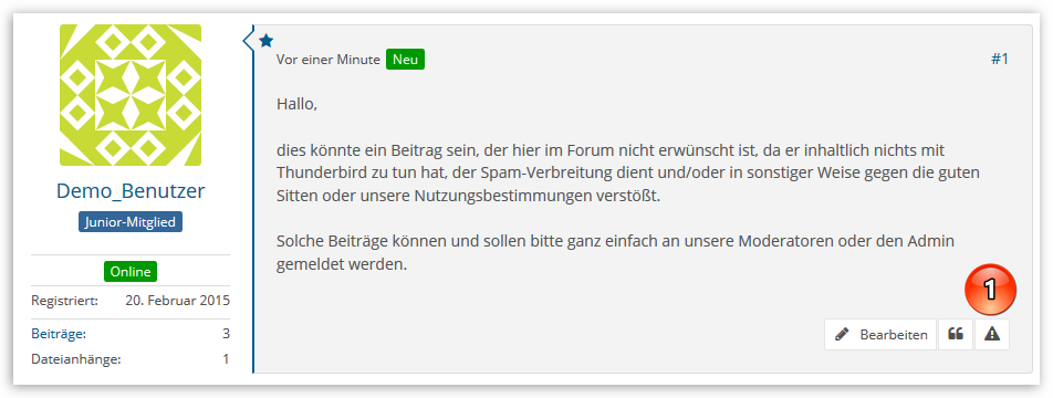 Die im Folgenden beschriebene Funktion, um Inhalte zu melden, steht nur angemeldeten (eingeloggten) Benutzern zur Verfügung. Wenn Sie kein Benutzerkonto für unser Foren-System besitzen, können Sie sich direkt per E-Mail an den Administrator der Seite wenden (siehe im Impressum). Der bessere Weg ist aber auf jeden Fall, die hier gezeigte Melden-Funktion zu benutzen.