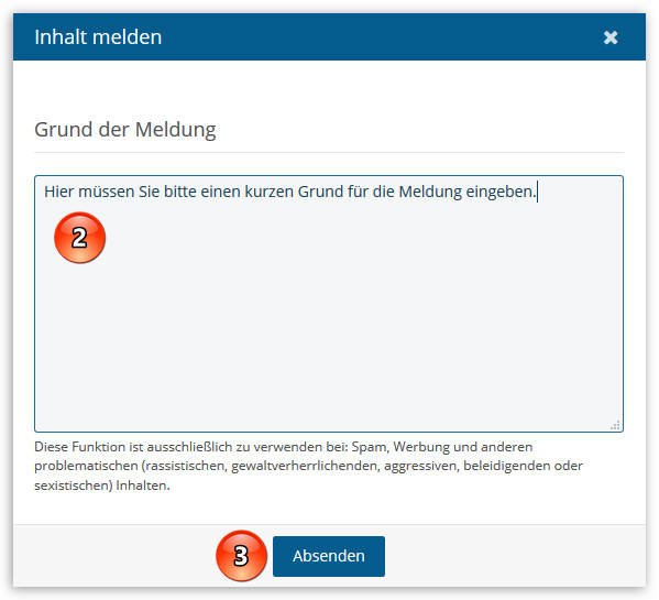 Damit wir wissen, was Sie an dem gemeldeten Foren-Beitrag oder Lexikon-Artikel inhaltlich unpassend bzw. unerwünscht finden, müssen Sie bitte eine kurze Beschreibung bzw. Begründung (Punkt 2) eingeben. Abschließend klicken Sie auf die Schaltfläche "Absenden" (Punkt 3), um die Meldung nun wirklich an uns zu senden: