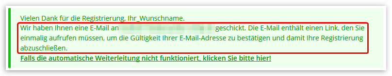 Es erscheint dann ein Hinweis, dass eine E-Mail an Sie gesendet wurde, mit deren Hilfe Sie die Registrierung noch abschließen müssen: