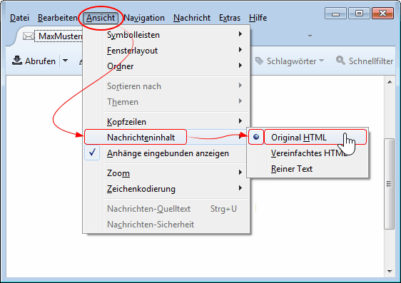 Der Nachrichteninhalt muss als "Original HTML" angezeigt werden. Um dies zu aktivieren, gehen Sie zu dem Menüpunkt Ansicht ➔ Nachrichteninhalt ➔ Original HTML: