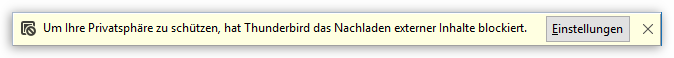 Thunderbird lädt die externen Inhalte standardmäßig nicht herunter, wenn Sie eine entsprechende E-Mail anzeigen lassen. Am oberen Rand der angezeigten E-Mail erscheint stattdessen die Benachrichtigungsleiste mit der Meldung: "Um Ihre Privatsphäre zu schützen, hat Thunderbird das Nachladen externer Inhalte blockiert":