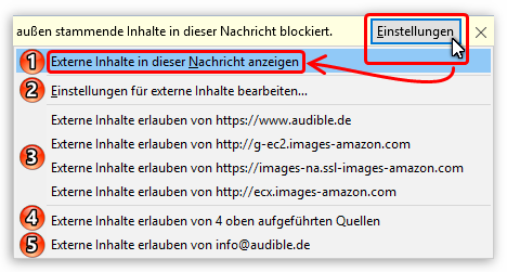 Wenn Sie die momentan geöffnete bzw. angezeigte Nachricht gerne komplett mit externen Inhalten anzeigen lassen möchten, klicken Sie auf die Schaltfläche Einstellungen und wählen im Kontextmenü den Eintrag "Externe Inhalte in dieser Nachricht anzeigen" (Punkt 1). Dies erlaubt und lädt alle externen Inhalte für diese eine Nachricht.