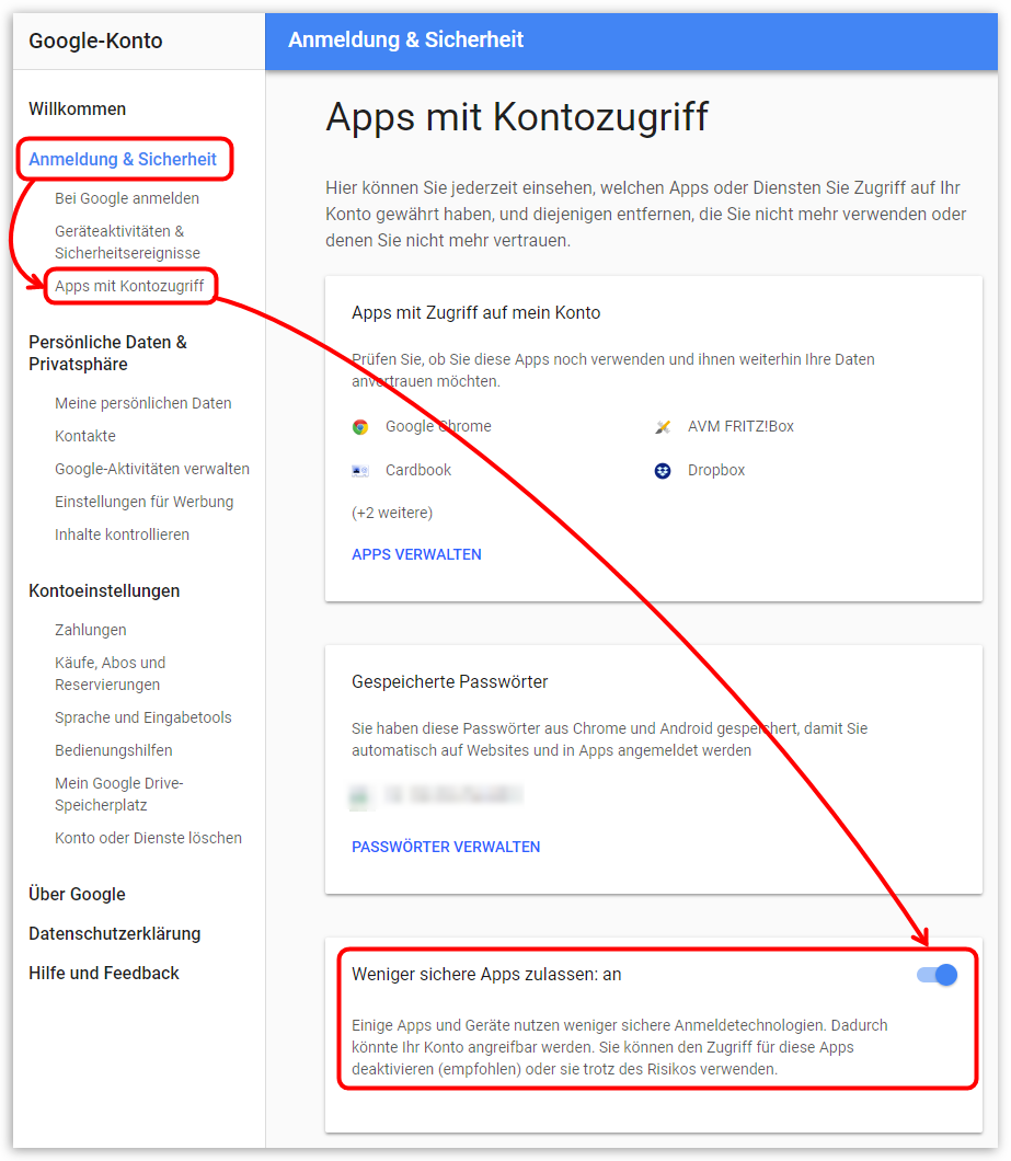 1.2 Weniger sichere Apps zulassen