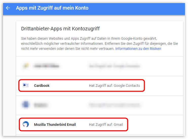 Sobald Sie auf der Einstellungen-Seite der Apps mit Kontozugriff sind, können Sie dort eine Liste mit den bereits erlaubten Programmen sehen. Per Klick auf einzelne Elemente dieser Liste erhalten Sie auch weitere Informationen, worauf die Programme zugreifen dürfen (beispielsweise Kontakte, E-Mails etc.). Sie können dort allerdings nicht direkt Programme hinzufügen. Es ist nur eine Liste der Programme, die bereits Zugriff hatten. Man könnte hier einzelnen Programmen den Zugriff wieder entziehen.