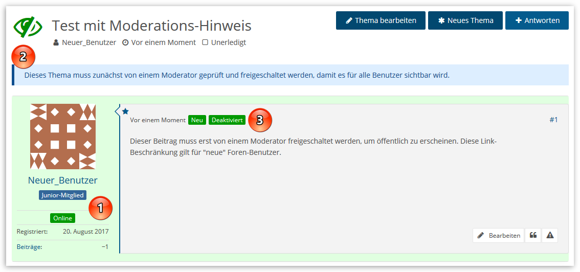 Die grüne Hintergrundfarbe (Punkt 1) und der entsprechende Hinweis (Punkt 2) zeigen Ihnen, dass der Beitrag zunächst deaktiviert (Punkt 3) und somit noch nicht öffentlich sichtbar ist. Sobald Ihr Beitrag von einem Moderator freigeschaltet wurde, verschwindet die grüne Hintergrundfarbe und jeder im Forum kann Ihren Beitrag dann lesen.