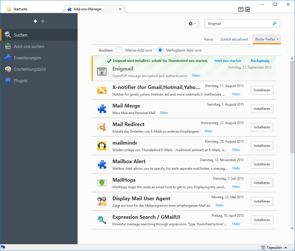 Installieren Sie das gewünschte Add-on durch Klick auf Installieren (Punkt 3). Bei manchen Add-ons müssen Sie Thunderbird durch einen Klick auf Jetzt neu starten im Add-ons-Manager neu starten, um das Add-on noch zu aktivieren, bei manchen anderen können Sie ohne Neustart des Thunderbird direkt damit arbeiten: