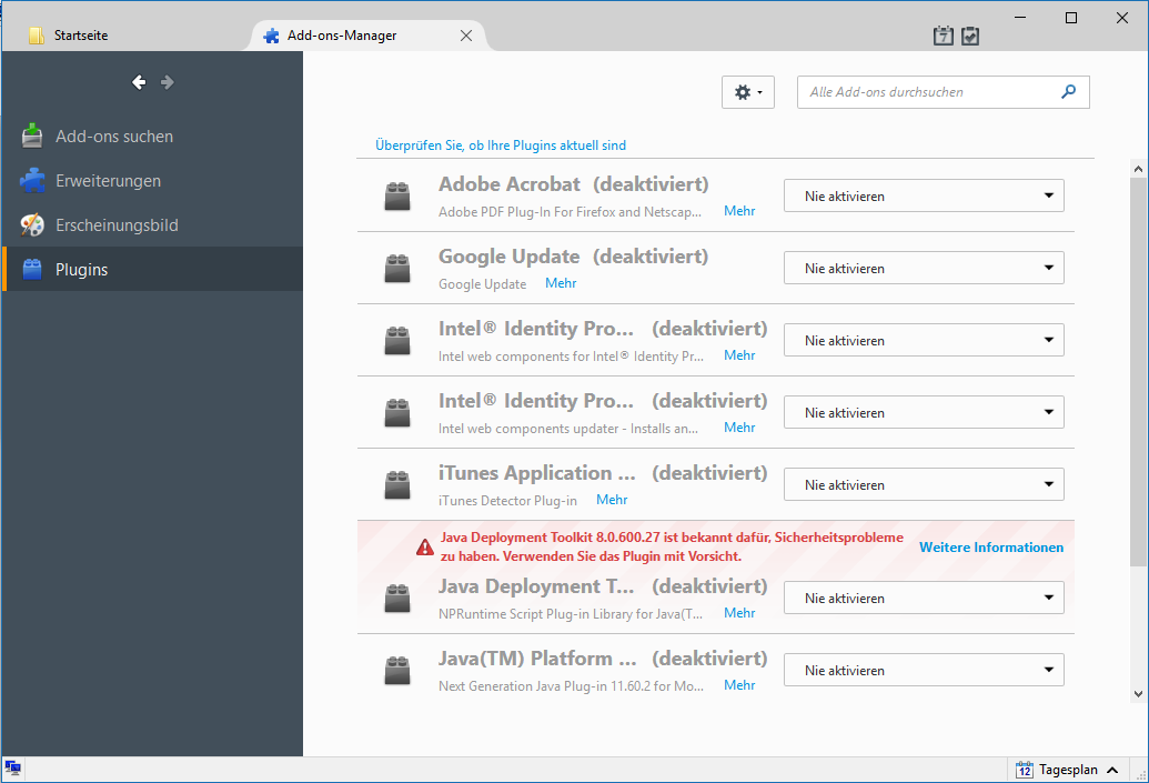 Plugins sind ein Sonderfall unter den Add-ons, da diese in der Regel für Web-Browser gedacht und installiert werden. Plugins unterscheiden sich technisch von allen anderen Add-ons und werden bei der für Web-Browser gedachten Installation (leider) auch systemweit mit in Thunderbird installiert. Auf Grund von Sicherheitsaspekten kann man die Plugins im Add-ons-Manager deaktivieren. Öffnen Sie den Add-ons-Manager und wählen Sie links den Bereich Plugins. Sie erhalten dann eine Liste aller installierten Plugins: