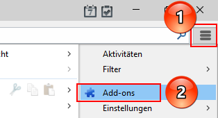 Öffnen Sie den Add-ons-Manager in Thunderbirds Hauptfenster über das Menü Extras ➔ Add-ons (Punkt 1, dann Punkt 2) bzw. über das entsprechende Symbol (Punkt 1) für das Menü in der Funktionen-Symbolleiste und dann ebenfalls über den Menüpunkt Add-ons (Punkt 2![]()
