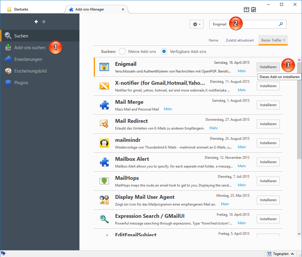 Im Add-ons-Manager gehen Sie links auf Add-ons suchen (Punkt 1) und geben oben rechts in das Eingabefeld (Punkt 2) den Namen eines Add-ons oder einen passenden Suchbegriff ein. Starten Sie die Suche mit der Eingabetaste. Es werden entsprechende Ergebnisse aufgelistet. Im Beispiel hier ist "Enigmail" ganz oben dabei: