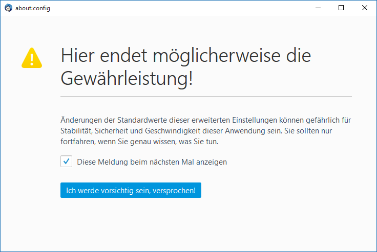 Wenn Sie mit Ich werde vorsichtig sein, versprochen! antworten, öffnet sich der Konfigurations-Editor, der auch als about:config bekannt ist: