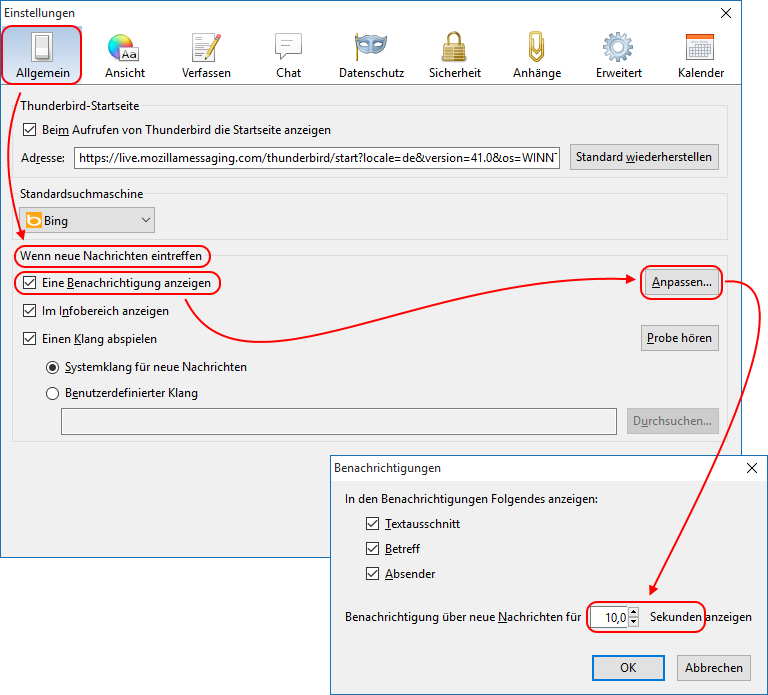 - Beim Aufrufen von Thunderbird die Startseite anzeigen