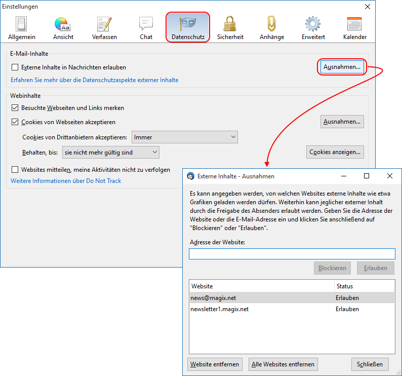 Durch den Aufruf bestimmter Nachrichten-Inhalte aus Thunderbird heraus kommt man auch in Thunderbird mit Cookies "in Kontakt". Man kann Cookies pauschal akzeptieren oder eventuell besser diese Option deaktiviert lassen. Es können dann bei Bedarf einzelne Internetadressen für Cookies akzeptiert werden, die man unter Ausnahmen aufgelistet findet. -