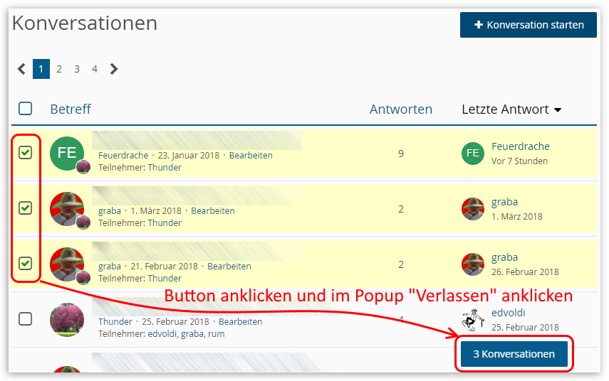 In der Liste der Konversationen können Sie dann auf der linken Seite die gewünschten Konversationen auswählen. Es ist dabei mit dem Kästchen ganz oben in der Überschrift der Spalten auch möglich, alle gelisteten Konversationen der angezeigten Seite zu (de-)markieren. Sobald eine oder mehrere ausgewählt sind, erscheint rechts unten im Bildschirm die Schaltfläche "X Konversationen". Die Schaltfläche zeigt dabei direkt auch die Anzahl der gewählten Konversationen an (hier im Bild also die Anzahl "3"). Klicken Sie die Schaltfläche an, es öffnet sich ein Menü an der Schaltfläche. In diesem Menü wählen Sie die Funktion "Verlassen". Anschließend sollte wieder Platz für die Teilnahme an neuen Konversationen hier im Foren-System sein.