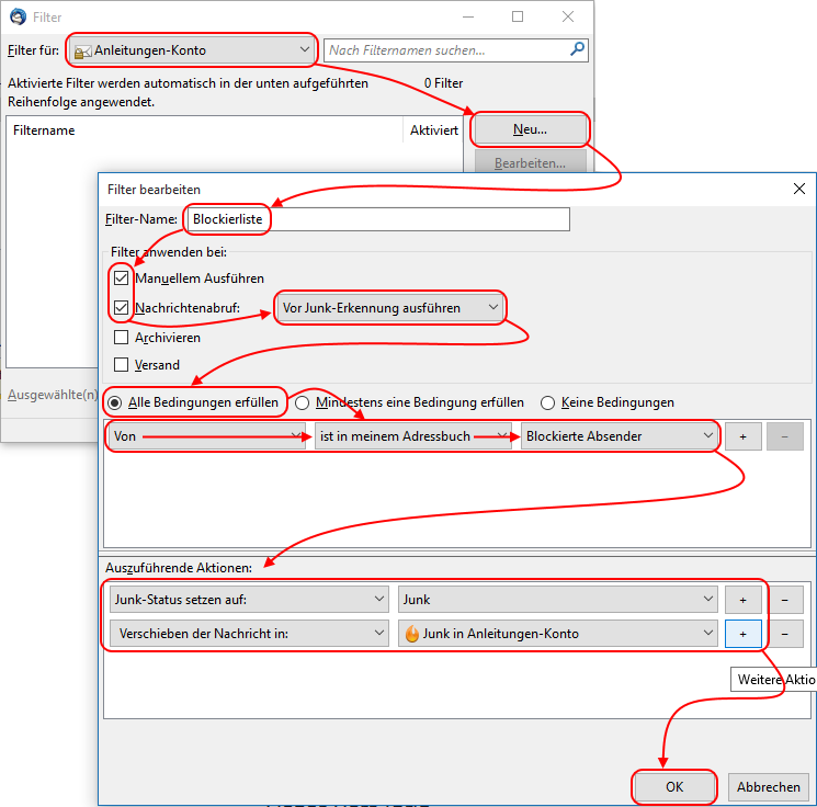 - Verschieben der Nachricht in: ➔ Junk in "Ihrem Konto"