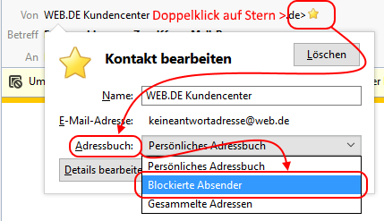 Wenn diese Blockierliste bei mehreren Konten eingesetzt werden soll, muss für jedes Konto der entsprechende Filter eingerichtet werden. - Nun können Sie im Laufe der Zeit beliebige Absender zu dem [lexicon='Adressbuch',''][/lexicon] "Blockierte Absender" hinzufügen: