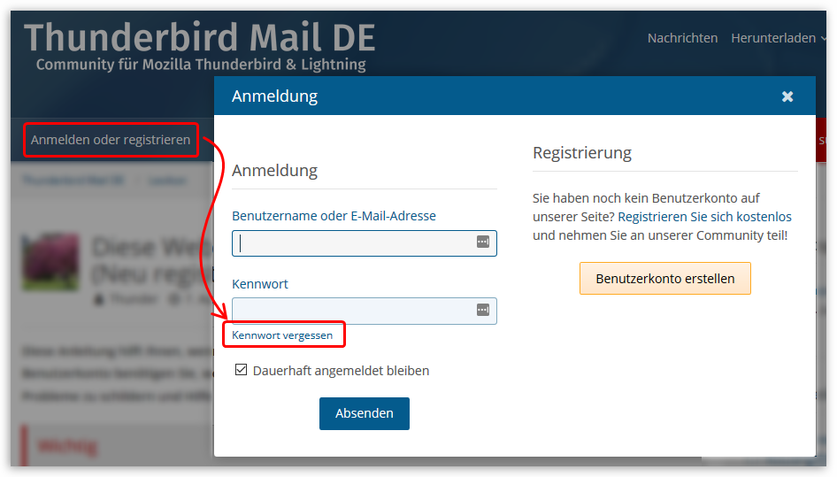 Um ein neues Passwort festzulegen, klicken Sie auf unserer Webseite als Erstes links oben in der Benutzerleiste auf "Anmelden oder registrieren". Der Anmelde-Dialog öffnet sich, und Sie können darin direkt auf "Kennwort vergessen" klicken: