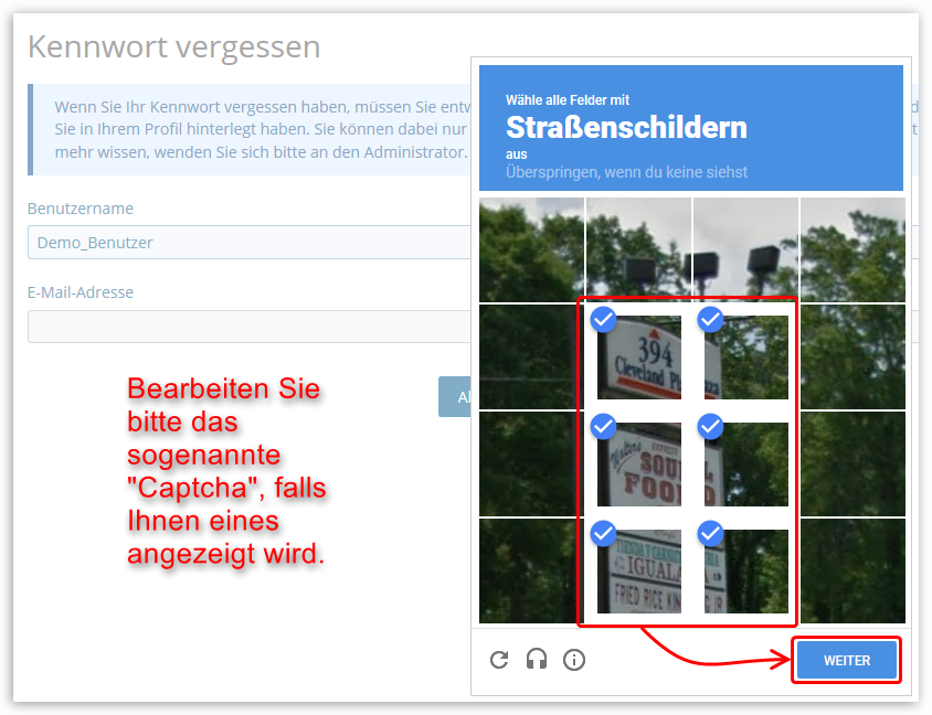 Zusätzlich bearbeiten Sie bitte die Sicherheitsabfrage (ReCAPTCHA) des Systems korrekt, falls Ihnen das Captcha angezeigt wird: