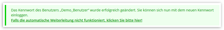 Wenn Ihr neu gewähltes Passwort die Anforderungen erfüllt, sehen Sie die folgende Bestätigung, dass es akzeptiert und gespeichert wurde: